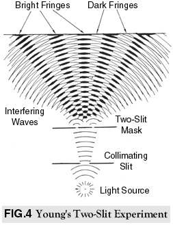 Another difficulty is presented by the enigma called, "wave-particle duality". A number of small holes can be made in a barrier to be bombarded with any kind of sub-atomic particle. The intensity can be arranged so low that the particles pass through the holes only one at a time. Although one particle can only go through one hole it subsequently behaves as if it had gone through all holes at once. It behaves like sets of waves emerging from every hole simultaneously to produce an interference pattern, the signature of wave effects. Young's two slit experiment, illustrated in FIG.4, shows such interference patterns moving towards a screen where they produce a pattern of light and dark bands. These are due to waves in phase adding by "constructive interference" whilst those out of phase subtract.