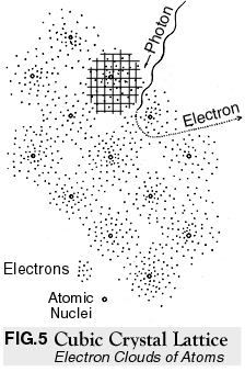 In FIG.s 2 & 3 the grid structure of the nuether is shown and the quantum waves spontaneously generated form interference patterns, an example being shown in FIG.4. These specify where imploding waves are to be focused to create sub atomic particles and these form atoms of crystals etc. as shown in FIG.5 (with nuclei on a square grid: inclined so as not to line up with grid symbolism)