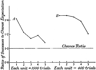 Graph No. 7. Decline of ESP ability in Stuart. A, first period, 1931-2. B,