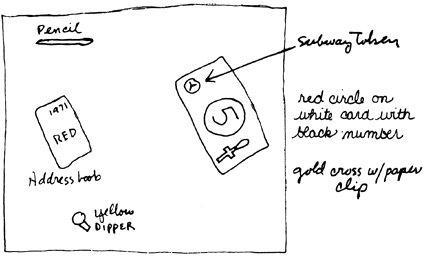 placed a subway token, a cross on a safety pin (again), and a red circle with a