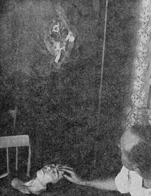 Anna said that she saw the robes but not the face. Walter then said that the face was there in the teleplasm and could be photographed. Then after a moment or two of silence, as though he were nerving himself to do it, he said: 'You'd better take it. Are you ready? One, Two, Three, Fire!' Exposure made at 10.02.