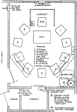 The séance room was situated on the second floor of Dr. Hamilton's home. Plate la shows its general arrangement. The simple furnishings consisted of plain wooden chairs, a plain unvarnished deal table, built after the lines suggested by