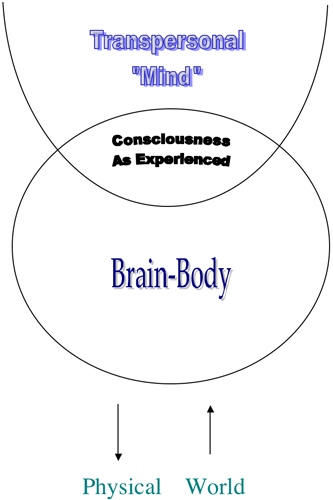 Using sophisticated glasses containing TV screens and earphones, a computer generated virtual reality has been shown to be quite effective at producing a convincing experience of a "different world." Most people who have tried virtual reality have been able to easily enter into a very different experience of "reality." For example, people have reported very different experiences of gravity while immersed in a virtual world. The main point Tart made is quite simple, but profound: we are in a virtual reality all the time! In other words, the way we sense the world is constructed and semi-arbitrary. We do not have a simple perception of the world out there. The so-called "real world" is actually our own virtual reality. To give an example, Tart mentioned that humans see more visual separateness than there really is in the world. The edges of physical objects are enhanced in human vision to increase the discrimination of objects, so that we can navigate our world more effectively. Thus, our unique visual system does not allow us to see the world-as-it-is. Instead, asTart puts it, we are immersed in a bio-psychological virtual reality all the time that shapes and conditions the way we sense and experience the world. According to Tart's model, the interface between the transpersonal "mind" and our brain-body's computational assessment and virtual reality construction of the physical world results in consciousness as-we-experience-it. Our consciousness is not pure, and we don't see "reality" as it is. Rather, what we experience is a semi-arbitrary construction derived from the balance between the transpersonal mind and the brain-body to produce a virtual reality that we simplistically call "reality." This virtual reality is a good simulation of the physical world, so it works well most of the time for our practical purposes, but it isn't reality per se. After death, however, our brain-body are gone, so the consciousness we have after death is most likely very different from the embodied consciousness we experience now on earth. Tart said that the consciousness of dreams and sensory deprivation probably are closer to the consciousness we experience after bodily-death. Drug-induced experiences likewise are clues to what dis-embodied consciousness is like. Tart's main point is that we should not assume that the consciousness that survives death will be just like our current experience of consciousness, largely because it will be dis-embodied, without all the normal limits on our daily virtual reality we experience in embodied life on earth. Tart noted that people who have reported OBEs (out of body experiences) have quite similar experiences compared to normal life because our embodied habits are so strong. But people who have experienced repeated or extended OBEs often report that their experience begins to be limited less and less by the constraints and habits of the body-brain. Charles Tart’s Model |