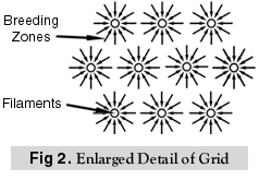 The network or grid, now defining the "nuether" and represented symbolically by a rectangular mesh in FIGs 3,5 and 6, would interconnect everything in the universe. As yet, however, no universe of matter could exist. Spontaneous creation of the nuether had to occur first, followed by evolution of its consciousness, since on this model matter would require deliberate design.
