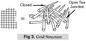 At larger scales bundles of the arrays of filament-containing cells will criss-cross in all directions as shown in Fig.3. It requires no mathematical formalism to see that, as a consequence of such random geometry, each filament will terminate at both ends in a tee-junction with some other filament which crosses its path. Due to the sharing of imploding flows near junctions a local thinning of filaments will result. The junctions, therefore, are weak points which can easily break. They can exist in bistable states: either open or closed.