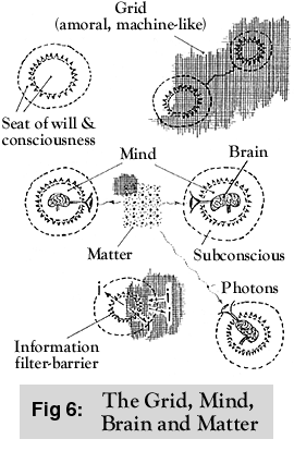 The reason for creation of matter can now be deduced. It would be needed to provide the primary mind with a set of meaningful environments. Fig.6 illustrates the possible overall structure. The primary mind exists as a myriad of conscious regions, or minds, of small volume interconnected by a vast machine-like net. The minds possess a sense of morality, the remaining network is amoral. Each mind is split into an individual conscious part and a subconscious part, the latter interconnecting with all others. The separation is provided by an "information filter-barrier", programmed as an enclosing shell, which prevents communication from the subconscious but permits flow of information in the reverse direction.