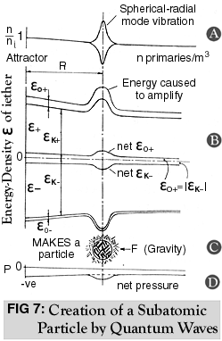At FIG.7a a spherical-radial mode of vibration is indicated as produced by quantum-wave focusing: its amplitude is indicated as number-density concentration n/ni where suffix i represents the initial state. Excess creation increases all local time-averaged energy densities as shown in FIG.7b at radius R, including the net values. The net negative pressure, shown at FIG.7d, is also amplified, being equal to ek-/3. In fact this means an extra life will be produced in trapped positive primaries to fill up this depression, so enhancing the amplification to produce a particle of dominant positive rest-energy. As shown in REF(7)p68&(9) filaments increase in radius when the creation rate is increased and it is this increased size together with the local negative pressure gradient which produces the gravitational force, as illustrated in FIG.7c.