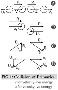 At A in a head on collision of a pair of primaries the momenta P+ and P- add so that neither can lose energy. At B a glancing impact adds transverse momenta, PT+ and PT-, shown at C, so causing extra energy of their own kind to be gained by each. Both move sideways in the same direction as shown at D.